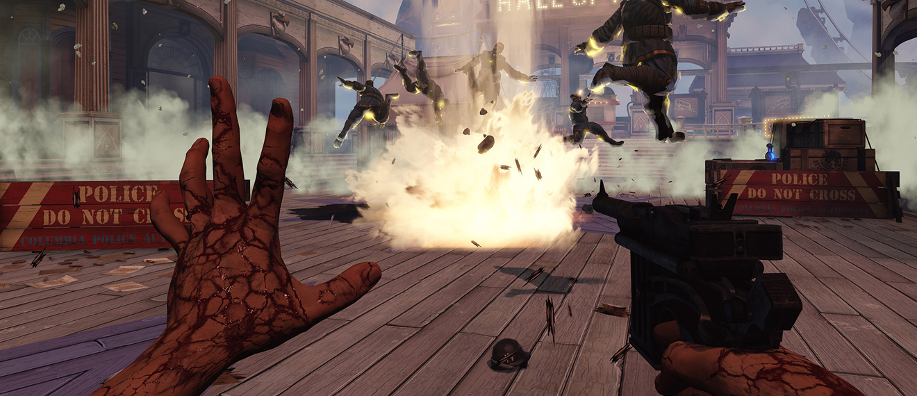 Vogliamo sottolineare come Columbia non sia soltanto un’ambientazione a sé stante: artisticamente parlando non abbiamo mai visto qualcosa di così affascinante in un videogioco. È una bomboniera steampunk dove tutto è meccanicizzato e fluttua come una barca alla deriva, intrecciandosi con le grosse aeronavi di linea che scorazzano mastodontiche ed indisturbate tra i tetti appuntiti degli edifici e le imponenti statue angeliche. Unico nel suo genere, Bioshock Infinite non dimentica alcune componenti basilari del suo gameplay e dello storytelling. È ancora possibile, infatti, recuperare un pò ovunque i famosi nastri lasciati da npg, marginali e non, per ascoltare le loro memorie, le impressioni e le confidenze della loro vita. Anche il gameplay rimarca il passato mantenendo le meccaniche di un puro first person shooter. Booker può contare su un discreto numero di armi, tutte potenziabili nelle loro statistiche, anche se un adeguato uso della magia rende più strategici gli scontri a fuoco. I Vigor, ovvero le abilità principali del protagonista, possono essere quasi sempre utilizzati in due modi distinti e separati: scagliarli contro l’obiettivo o creare delle apposite trappole a terra, pronte a scattare non appena il nemico vi mette un piede sopra. Quando le distanze si accorciano è invece necessario utilizzare lo Sky-Hook, un particolare uncino adatto per il corpo a corpo nonché strumento utile per spostarsi tra i numerosi binari che separano i vari isolotti di Columbia. Un’altra novità riguarda l’equipaggiamento di Booker; sparsi nelle aree di gioco vi sono, infatti, dei capi d’abbigliamento in grado di conferirgli ulteriori poteri. Bioshock Infinite è un titolo che, nonostante la sua linearità, ha molto da offrire al giocatore in termini di esplorazione. Questa componente è a dir poco fondamentale non solo per quanto concerne la trama (ricordate i nastri citati ad inizio articolo), ma soprattutto per le munizioni, grimaldelli, pozioni e soldi disseminati un pò ovunque e credeteci…non bastano mai! Alla fine c’è lei, Elizabeth, al centro di tutto e tutti: una compagna di viaggio viva, emotiva, espressiva e mai d’intralcio. Un personaggio decisamente autonomo ed in grado di avvertire il pericolo nascondendosi dal fuoco nemico, che richiama la nostra attenzione con commenti sempre azzeccati e ci rifornisce di oggetti utili quando siamo alle strette.