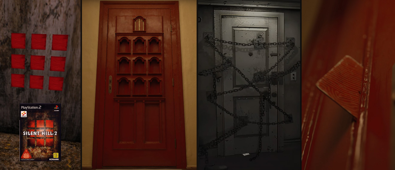 Osservate bene i nove pannelli disposti in una griglia tre per tre di quell’imponente ingresso: ricordano in parte il simbolo stampato sulla copertina giapponese di Silent Hill 2, nonché l’ultimo punto di salvataggio della storia di quel capitolo.
