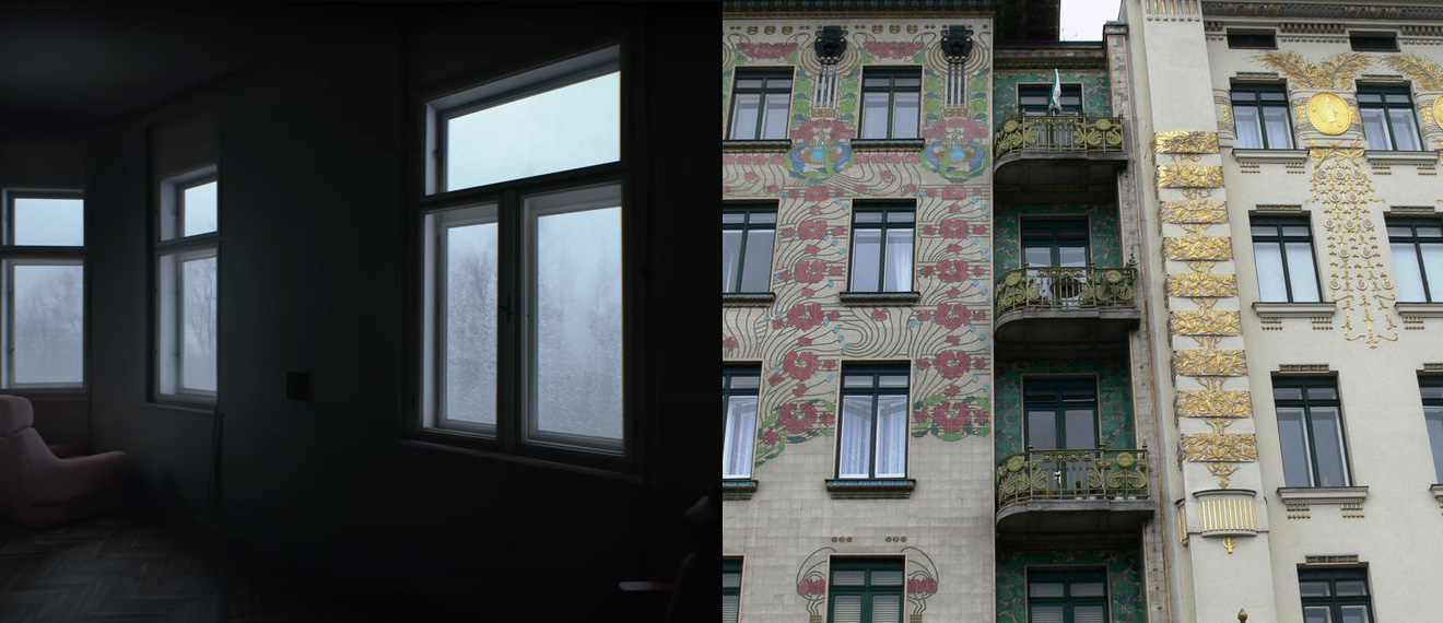 Prima di parlare dei “sopravvissuti” appena citati, soffermiamoci a osservare la stanza: cupa per via della pioggia che si intravede dalle finestre, con due poltrone disposte in modo insolito, il pavimento in legno a spina di pesce, un piccolo altarino con delle candele e, se osservate attentamente, fotografie di occhi umani appese alle pareti. Persino il lampadario ricorda un bulbo oculare. Lo stile architettonico richiama quello prebellico (1900-1940) dell’Europa centrale, in particolare Germania e Austria.