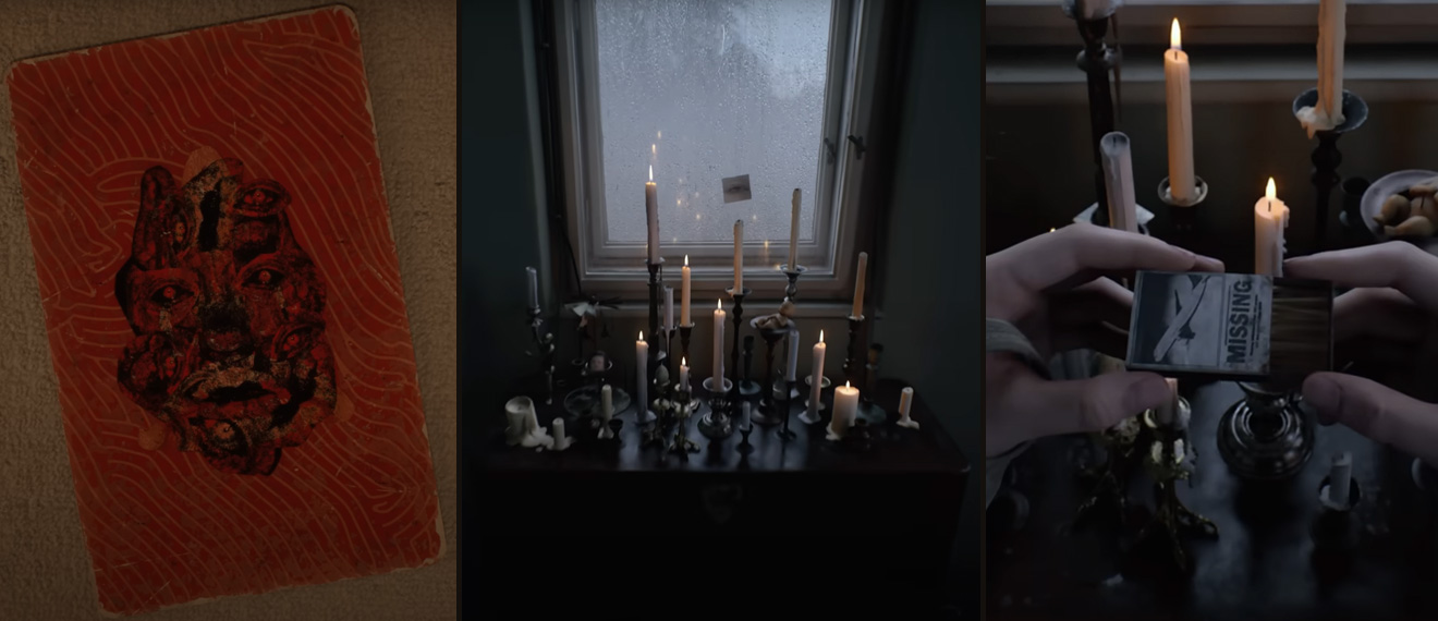 No, non mi sono dimenticato di citare il disegno e il testo della carta fatta passare attraverso la porta, ho atteso questo momento per farvi concentrare su un dettaglio preciso. Contate il numero di occhi aperti raffigurati sulla carta in questione e poi le candele accese sull’altarino in fondo alla scala: sono sette.